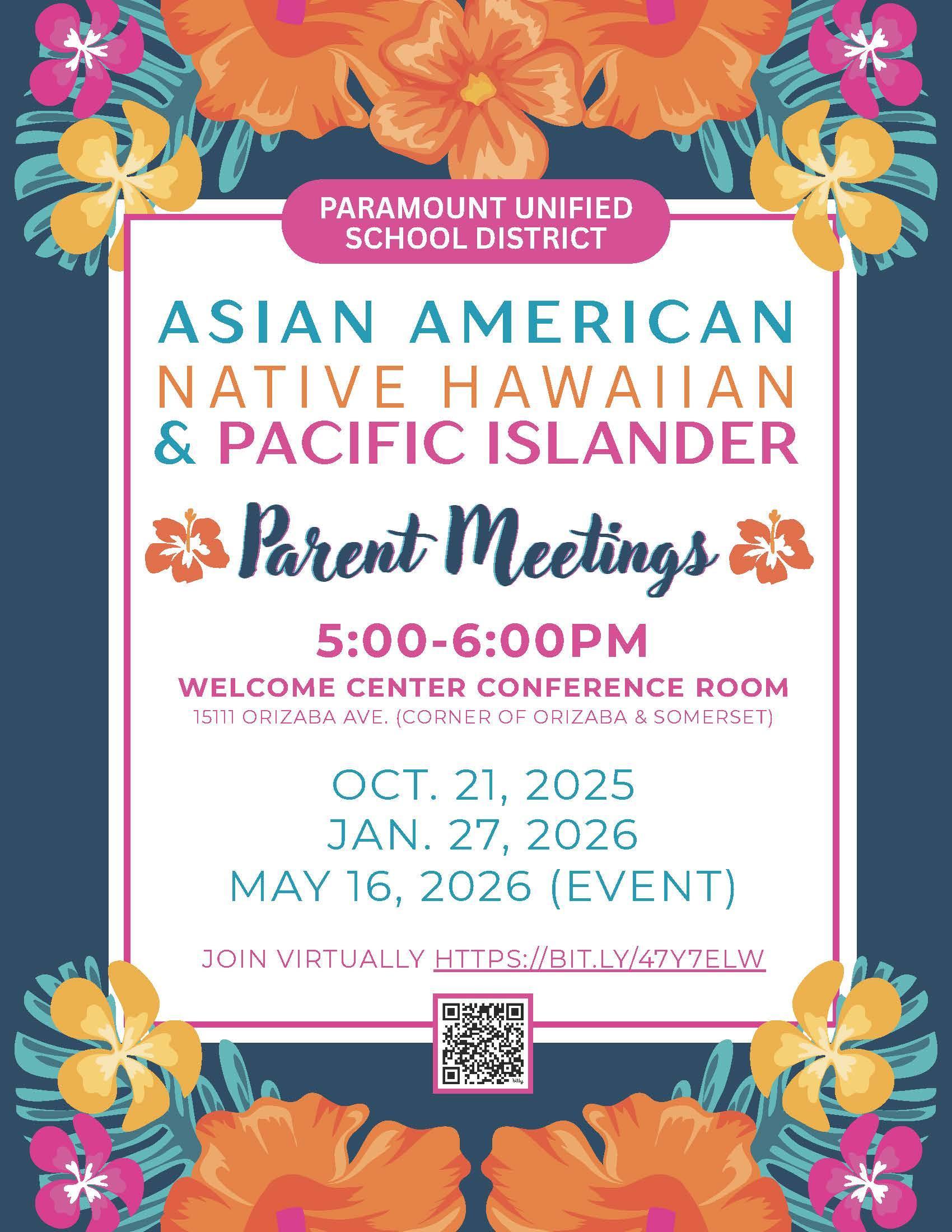Paramount Unified School District welcomes families to join its Asian American, Native Hawaiian, and Pacific Islander (AANHPI) Parent Meetings for the 2025–26 school year. These meetings create a space for families to connect, share experiences, and strengthen the partnership between school and home.